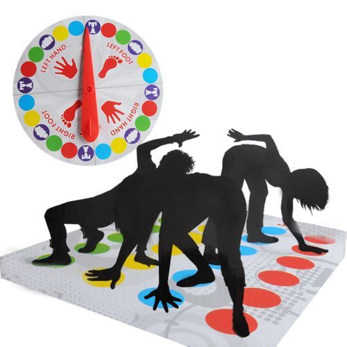 TWISTER game challenges you to put your hands and feet at different places on the mat without falling over! Be the last player standing to win