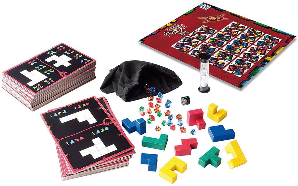 The newest addition to the Ubongo series. This time players place wooden tiles over two layers in 2-sided puzzle cards, one side for beginner players and one for more advanced ones. Players collect gemstones for their performance and the player with the most valuable gem collection at the end wins the game.