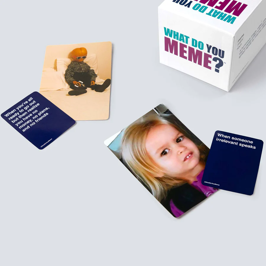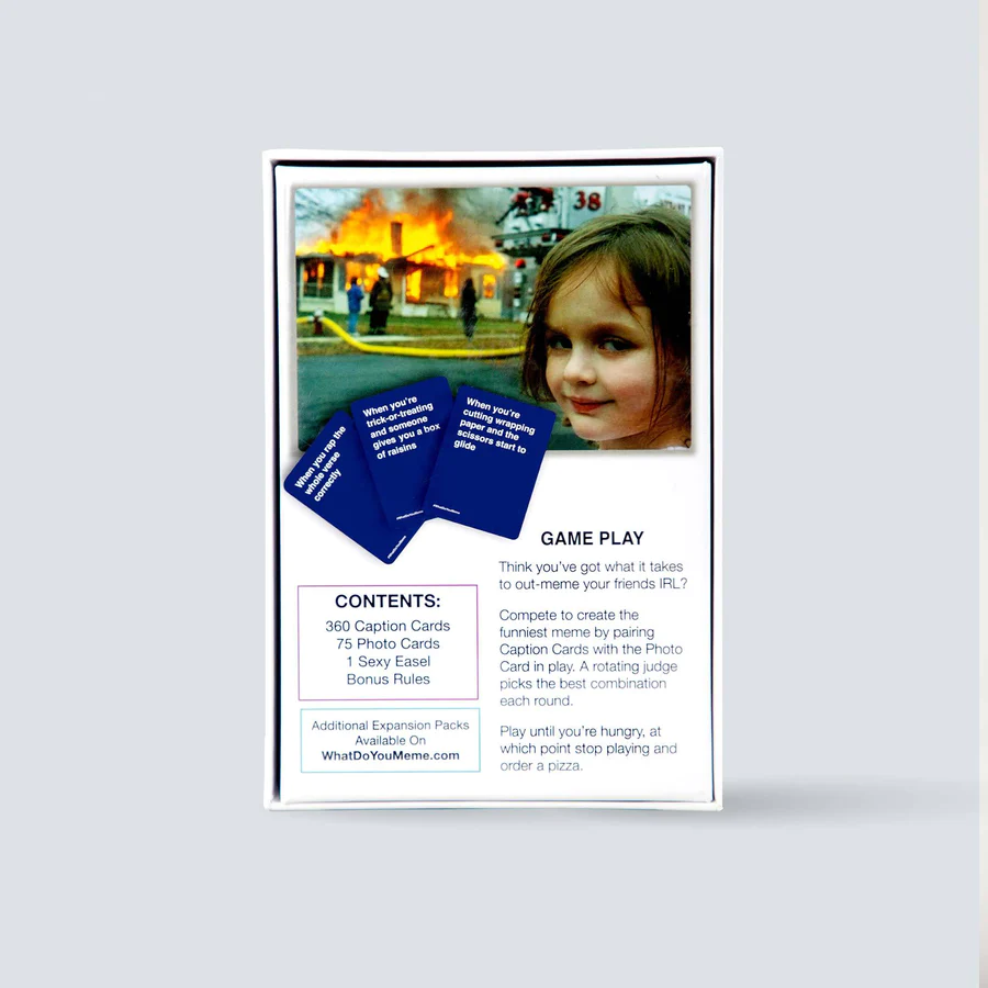 What Do You Meme?® lets you compete with your friends and family to create the funniest memes. Each player draws seven caption cards. A designated photo card is chosen for the round and placed on the easel, and everyone except the judge chooses a caption card to pair with the photo card, passing it to the judge face down.